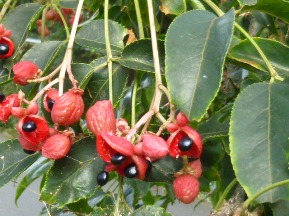 ・果実 9〜11月 赤く熟して裂開し、中から黒くて光沢のある、種子が顔を出す。
